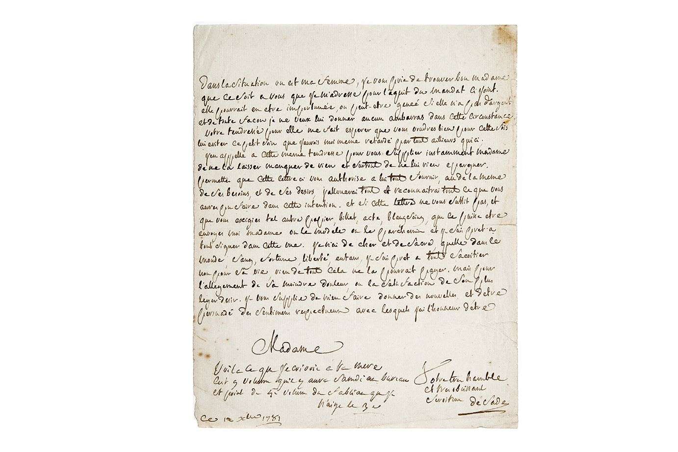 La lettre a été recopiée par Sade pour sa femme, comme l'indique le post-scriptum : « Voila ce que j'ecrivois a ta mere »...