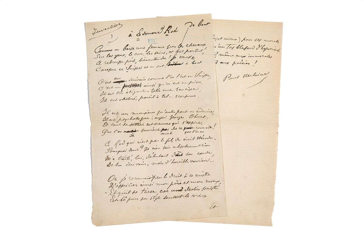 Destiné au recueil Invectives, publié chez Léon Vanier en 1896, ce poème de 6 quatrains (n° VII du recueil, numéro porté au crayon bleu sur le manuscrit) s'attaque à l'écrivain et critique littéraire suisse Edmond ROD (1857-1910). Le manuscrit présente quelques ratures et corrections.