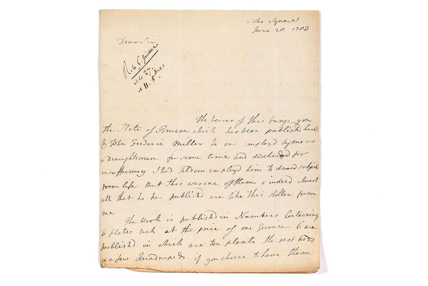 L'ouvrage compte 6 planches au prix d'une guinée contenant chacune 10 plantes et quelques quadrupèdes. Il ne pense pas que cette publication puisse décourager son correspondant de publier son propre Brucea, d'autant plus que Miller a presque épuisé tout ce qu'il a pu lui voler : « he has nearly exhausted the amount of what he can have stollen from me, and the plan was intended for 10 numbers »....
