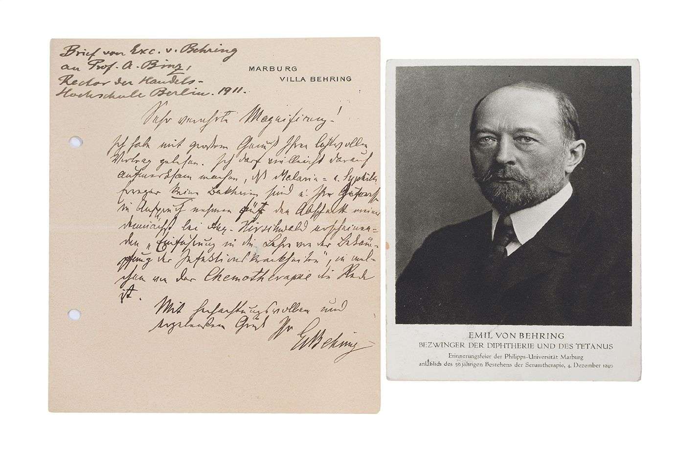 L.A.S. « EvBehring », Marburg [1911], au Prof. Arthur BINZ, recteur de la HandelsHochschule de Berlin | 1 page in-8 à son adresse Marburg Villa Behring (trous marginaux de classeur sans toucher le texte) | en allemand (portrait joint avec timbres à son effigie).