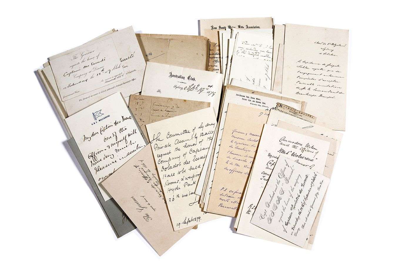Ensemble d'environ 70 lettres et cartes, Australie 1879, reçues par le capitaine Frédéric-Jean Dorlodot des ESSARTS (1832-1899).