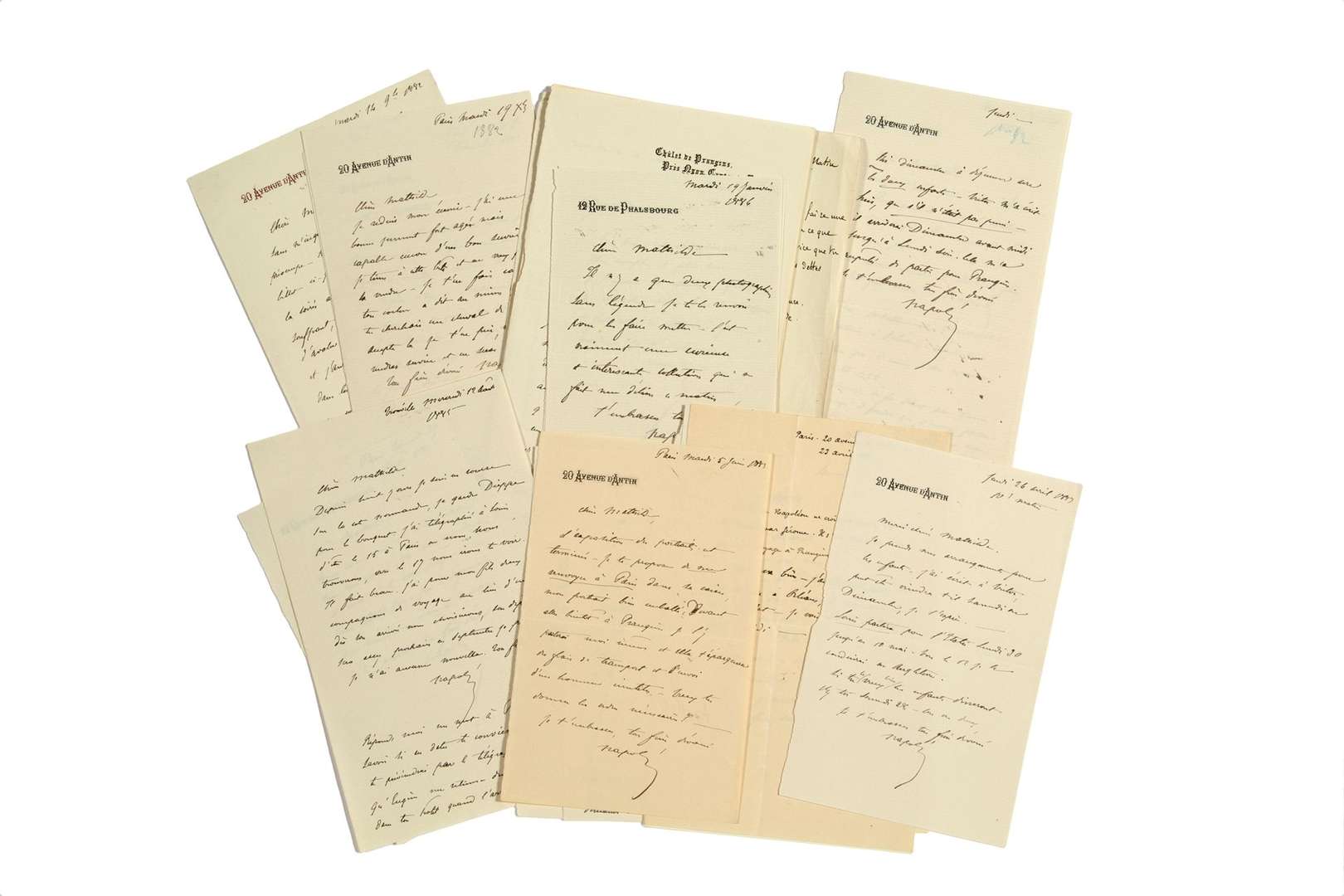 20 L.A.S. « Napoléon », 1882-1889, à la Princesse MATHILDE | 1 page in-8 chaque avec en-tête d'adresse.