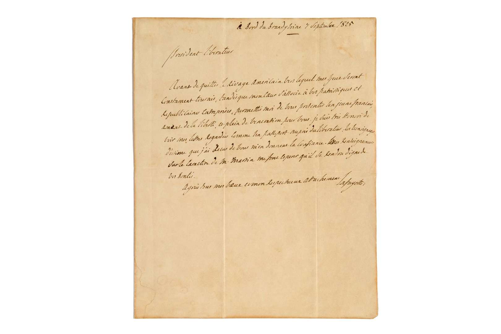 L.A.S. « Lafayette », à bord du Brandywine 7 septembre 1825, au « Président Libérateur » [Simon BOLIVAR] | demi-page in-4.