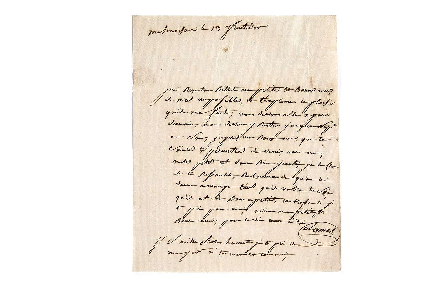 L.A.S. « Lannes », Malmaison 13 fructidor [31 août 1801], à SA FEMME | 1 page petit in-4, adresse (légères fentes au feuillet d'adresse).