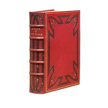 Le lys rouge. Paris, Simon Kra, 1925. In-8, maroquin rouge, dos à 5 nerfs saillants soulignés d'un pointillé doré, auteur et titre doré, caissons ornés de listels mosaïqués formant un motif ogival, les plats bordés d'un filet doré, d'un listel mosaïqué et de f leurs de lys en f leurons angulaires mosaïqués et dorés, filet doré aux coupes, contreplats bordés de maroquin orné d'un listel et de 4 f leurons aux angles, le tout mosaïqué, doublures et gardes de satin moiré rouge, deuxième garde de papier marbré, tête doré, non rogné, couv. et dos conservés, étui [Creuzevault] (dos foncé avec qq. frottements, un coin frotté, étui usé).