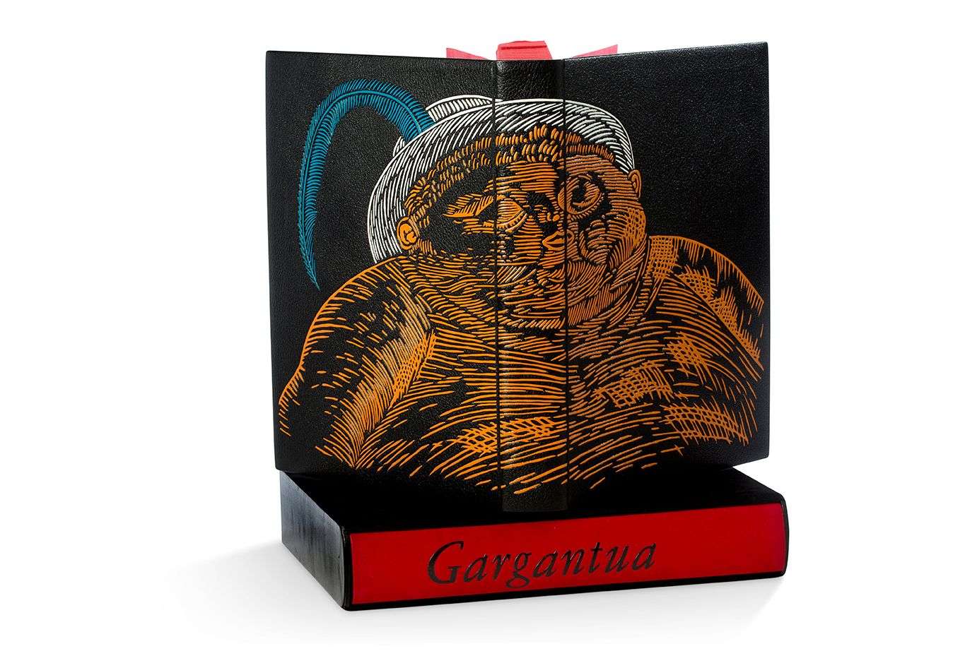 Gargantua. Lithographies de Clavé. S.l., Les Bibliophiles de Provence, 1955. Fort volume grand in-4, maroquin noir, dos lisse et muet, composition mosaïquée couvrant le dos et les plats, constituée de filets en orangé, bleu et blanc qui offrent un portrait de Gargantua enfant, doublures et gardes de daim vieux rose, les contreplats ornés d'une composition de fines pièces noires mosaïquées qui offrent un visage monstrueux d'inspiration asiatique, tête dorée, non rogné, couv. conservée, chemise de daim rouge portant au dos le titre mosaïqué, et au plat sup. le nom de l'auteur mosaïqué, étui noir en chagrin poli et daim assorti (légers transferts de qq. figures | infime frott. à l'étui).
