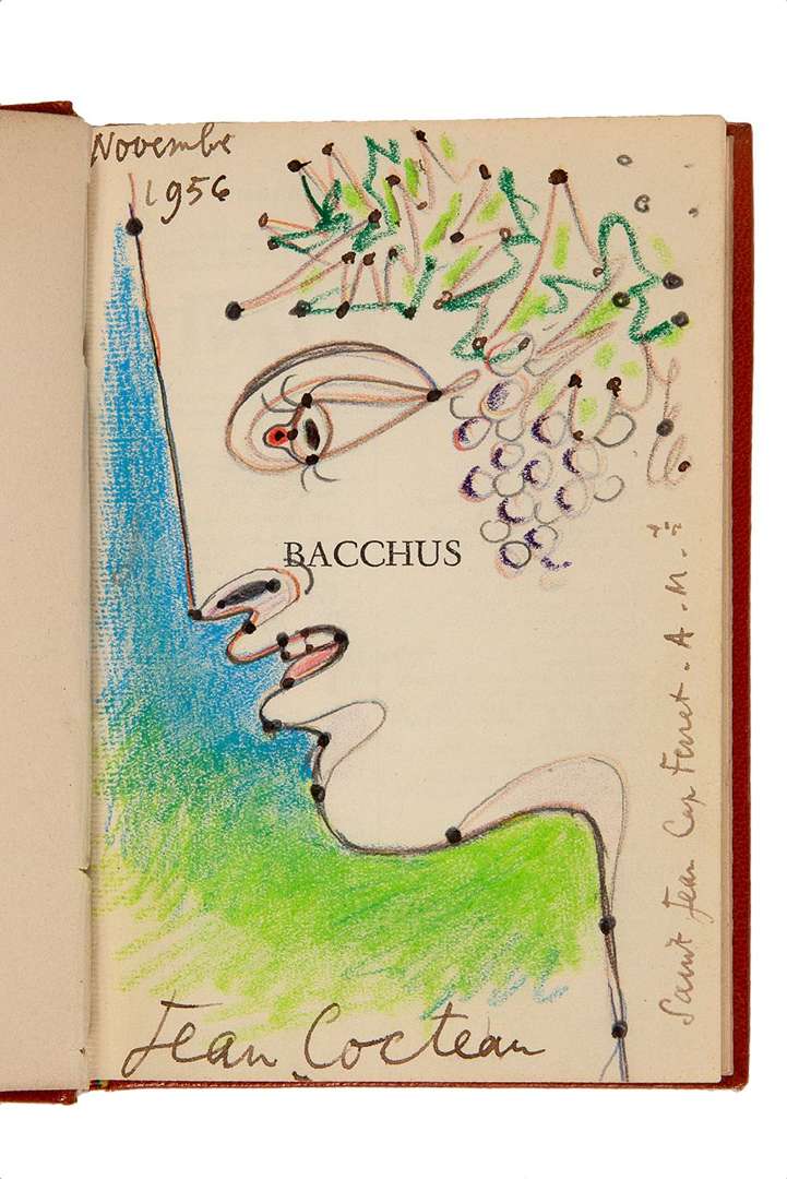 Exemplaire enrichi d'un dessin original en couleurs, au crayon et pastel couvrant le faux-titre, montrant un profil d'homme, signé et daté « Novembre 1956 » par Jean Cocteau, accompagné de la mention autographe « Saint Jean Cap Ferret A-M ».