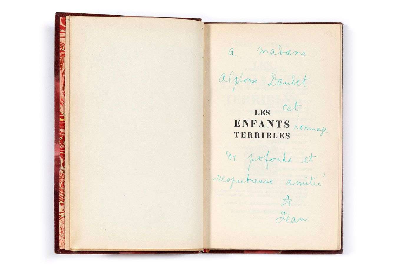 Les enfants terribles. Roman. Paris, Grasset (Pour mon plaisir), 1929. In-16, maroquin lie-de-vin à coins, dos lisse finement orné de 4 losanges mosaïqués et d'un jeu de f leurons dorés, auteur, titre et date dorés, filet doré aux plats, tête dorée, non rogné, couv. et dos conservés [Yseux s[u]c[cesseur] de Simier] (un coin frotté).