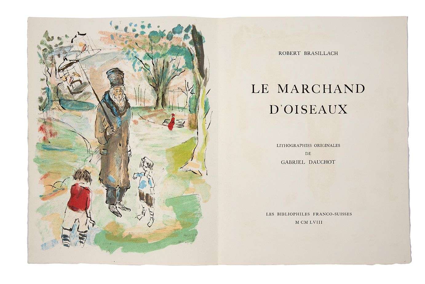 Le marchand d'oiseaux. S.l., Les Bibliophiles franco-suisses, 1959. In-4, en feuilles sous couv. rempliée, chemise et étui éditeur (couv. un peu insolée, très légers transferts de certaines ill., frott.