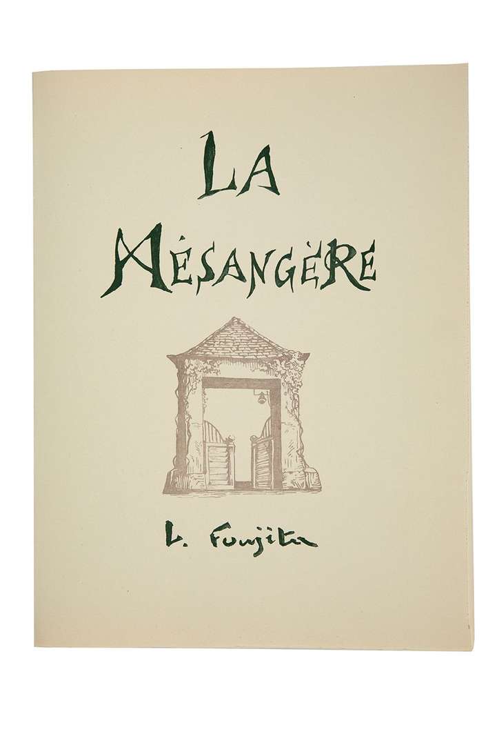 La Mésangère. [Paris], Pierre de Tartas, 1963. In-folio, 86 p., en feuilles sous couverture grise illustrée et rempliée, emboîtage de l'éditeur de toile bordeaux, intérieur de feutrine bleue, avec la signature de Foujita reproduite au bas du plat supérieur, titre et nom de l'artiste sur toute la hauteur du dos (dos de l'emboîtage passé, petits défauts sans gravité).