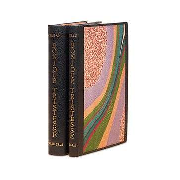 Bonjour tristesse. Paris, Lubineau, 1954. Deux volumes in-8, celui du texte maroquin bleu nuit, dos lisse portant le titre frappé en lettres blanches et orangé superposées, les noms d'auteur et illustrateur, les plat et dos offrant un décor mosaïqué en continu, doublure de maroquin orangé bord à bord avec un motif sur plat sup. rappelé en mosaïqué de maroquin blanc, demi-gardes de maroquin blanc bordé de maroquin orangé, couv. illustrée et dos conservés, tranches dorées sur témoins, chemise maroquin noir aux plats ornés d'un papier imprimé | le vol. de suite en maroquin noir aux plats ornés comme la chemise décrite, un cuivre monté au contreplat inf., l'ensemble dans un étui à 2 compartiments assorti [Galvan].