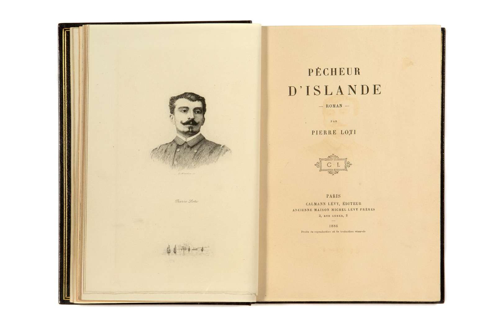 Pêcheur d'Islande. Roman. Paris, Calmann Lévy, 1886. In-8, maroquin brun foncé, dos à 5 nerfs saillants, auteur et titre doré, motif d'oiseau de mer mosaïqué au plat supérieur, double filet doré aux coupes, coiffes guillochées, contreplats bordés de maroquin orné de 4 filets dorés, tranches dorées sur témoins, couv. et dos conservés, étui [Marius Michel] (nerfs un peu passé, étui fendu et incomplet du fond).