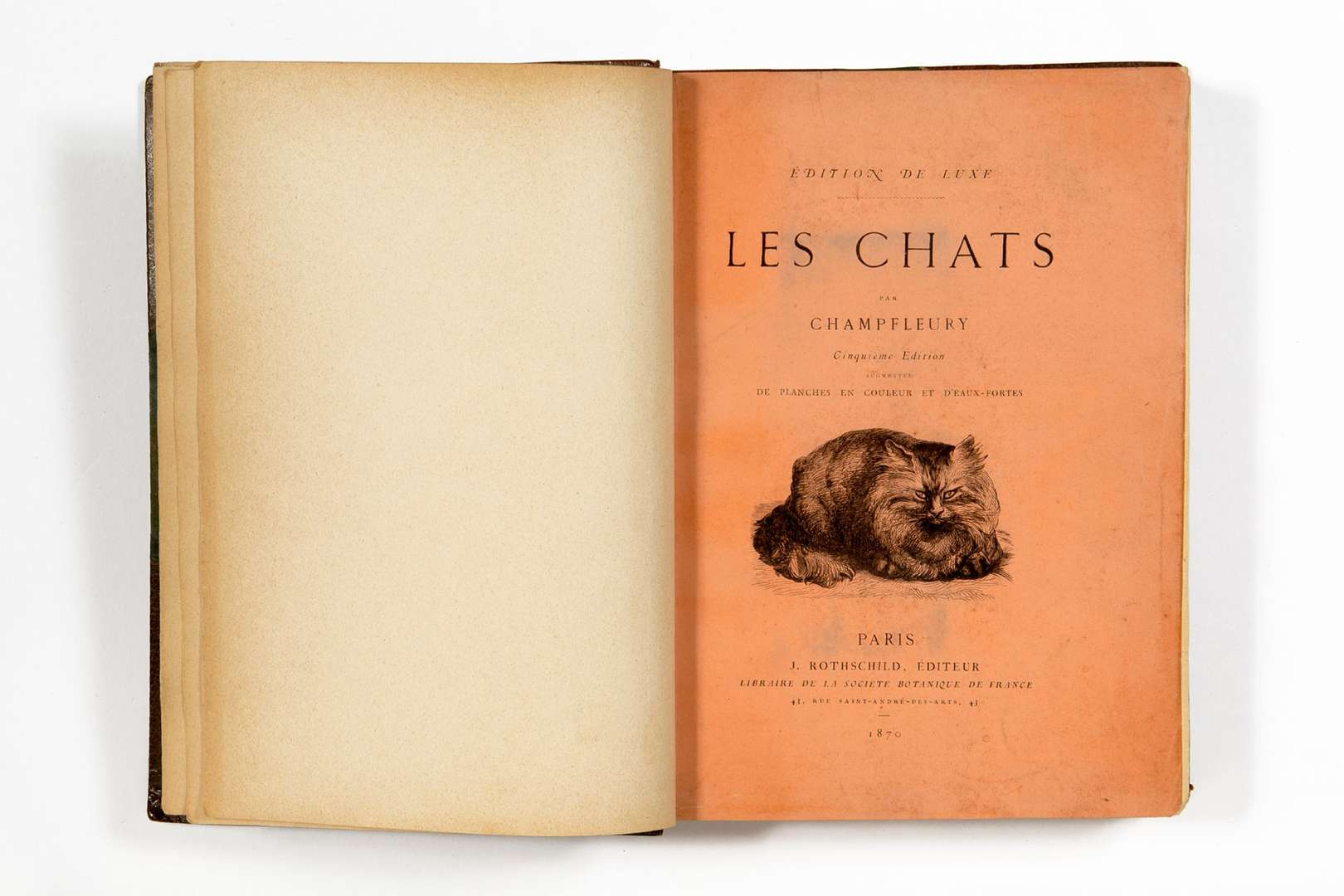 Les chats. Cinquième édition augmentée de planches en couleurs et d'eaux-fortes. Paris, J. Rothschild, 1870. In-8, demimaroquin poli vert bronze à coins, dos à 4 nerfs saillants, auteur, titre et date dorés, caissons ornés, filet doré aux plats, tête dorée, non rogné, couv. conservées [Durvand Pinard] (dos passé, 2 coins émoussés).