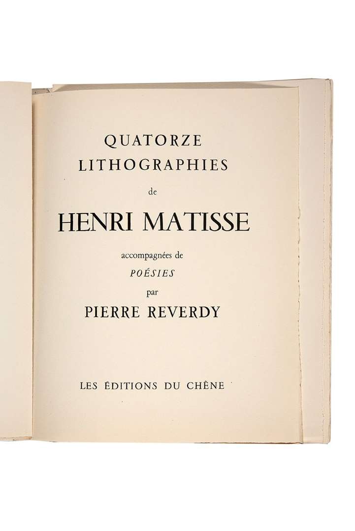 Visages. Quatorze lithographies de Henri Matisse accompagnées de poésie par Pierre Reverdy. Paris, Les Éditions du Chêne, 1946. In-4, [3] bi-feuillets (fx. titre, titre, justif.