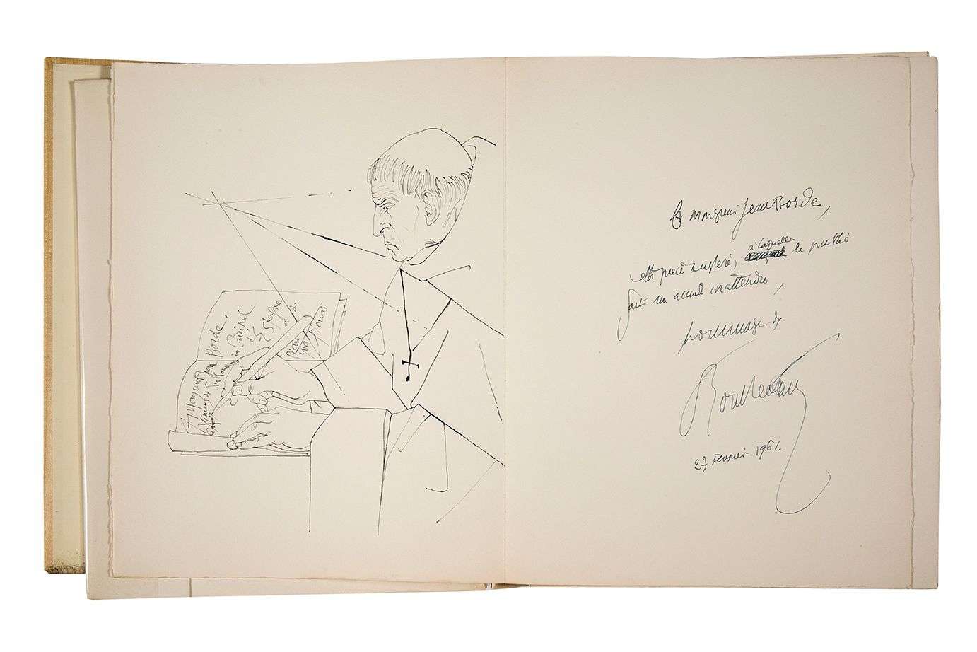 Enrichi d'un double envoi autographe signé à M. Jean Borde, de l'auteur, “cette pièce austère à laquelle le public fait un accueil inattendu...”, daté du 27 février 1961 | et de l'artiste, accompagné d'un dessin original à pleine page.