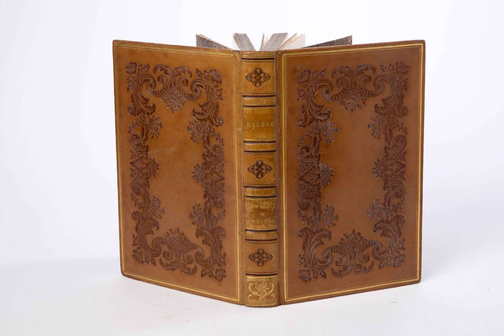 La peau de chagrin. Études sociales. Paris, Delloye et Lecou, 1838. Grand in-8, [2] f., 402 p., [1] f. (table), pl., fig., veau havane époque, dos à 4 nerfs plats, auteur et titre dorés, f leurons et filets dorés et à froid, plats bordés d'un listel et d'un filet dorés et orné d'une grande plaque rocaille à froid, double filet doré aux coupes, roulette intérieure, tranches dorées (qq. frott.