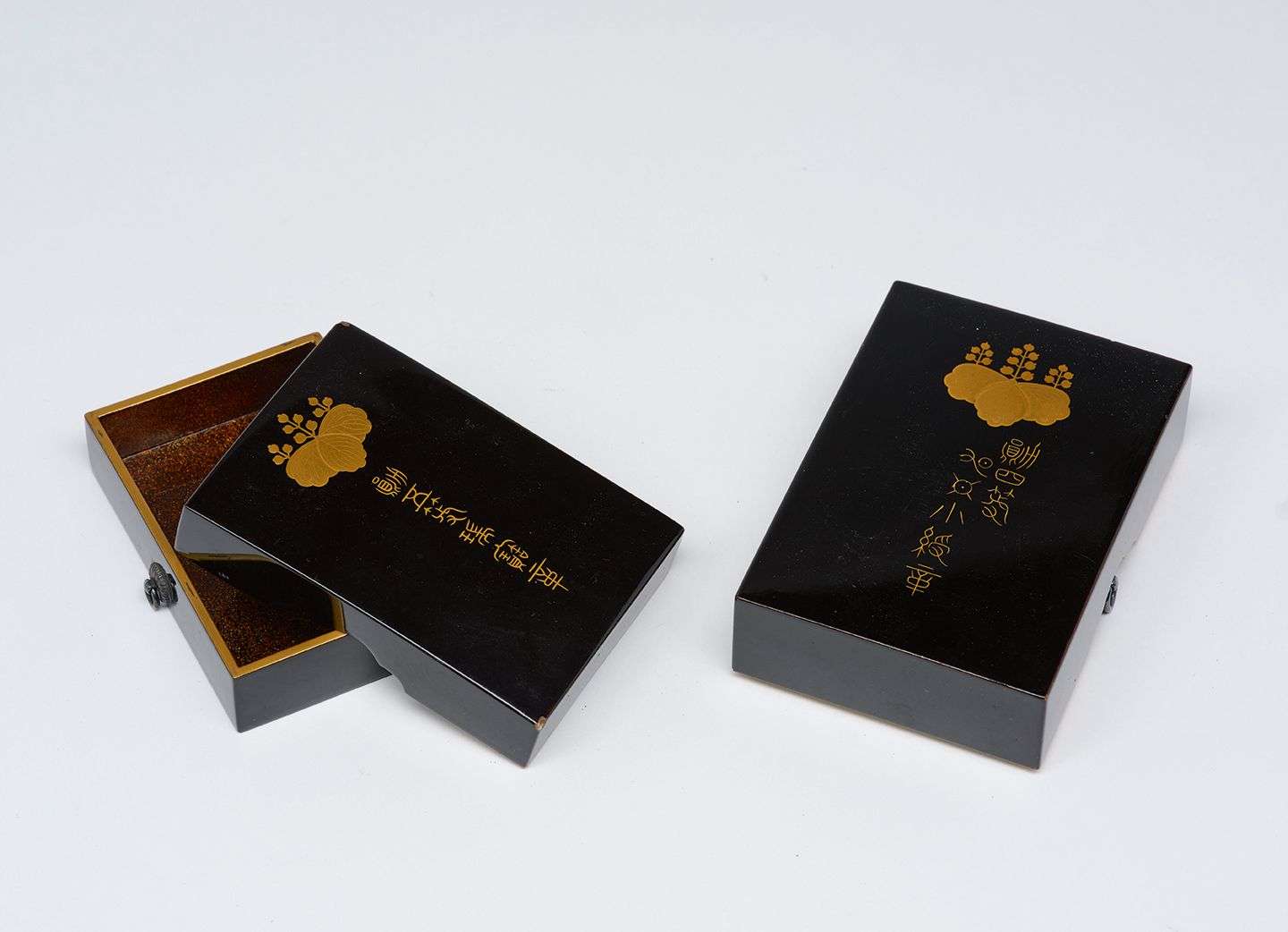 Deux boîtes pour décoration de l'Ordre du Soleil Levant en laque ro-iro, le couvercle décoré en laque maki-e de fleurs de pawlonia et inscriptions. Une boîte de IVe classe et une boîte de Ve classe. L'intérieur en laque nashiji.