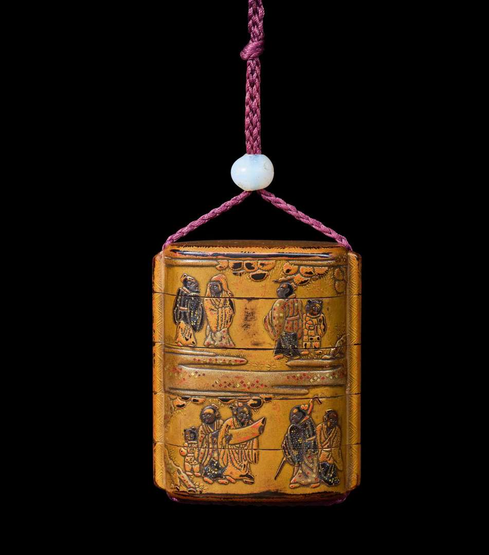 Inro à quatre cases en laque maki-e décoré en takamaki-e, kirigane et aogai de lettrés et leurs attendants jouant au go, lisant des rouleaux... L'intérieur en laque nashiji. Ojime postérieur en verre opalescent.