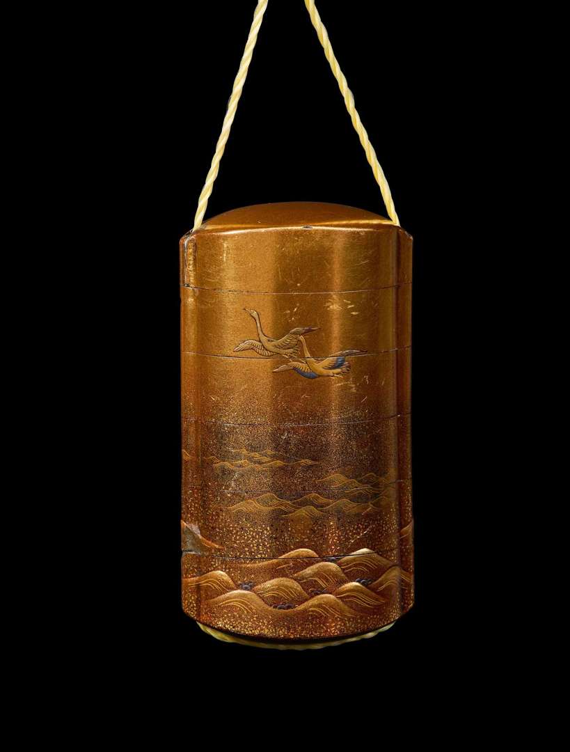 Inro à cinq cases en laque d'or hiramaki-e et takamaki-e d'or et d'argent décoré d'un takarabune chargé de trésors et d'oies sauvages en vol. L'intérieur en laque nashiji.