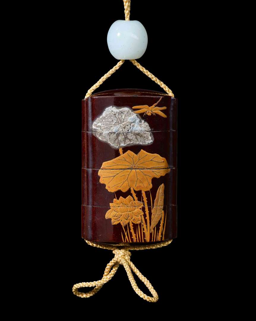 Inro à 3 cases en laque ro-iro décoré en hiramaki-e et takamaki-e d'or et d'argent de fleurs et feuilles de lotus. L'intérieur en laque ro-iro. Ojime en verre blanc opaque.