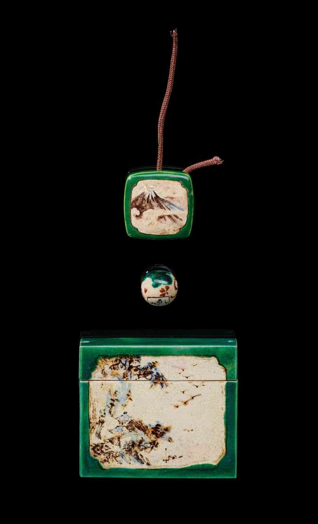 Inro à une case en céramique glaçurée décoré aux émaux polychromes sur fond crème d'un paysage de montagne esquissé, et signé « Kenzan » dans un cartouche vertical. Avec un ojime sphérique et un netsuke carré à décor en suite et signés.