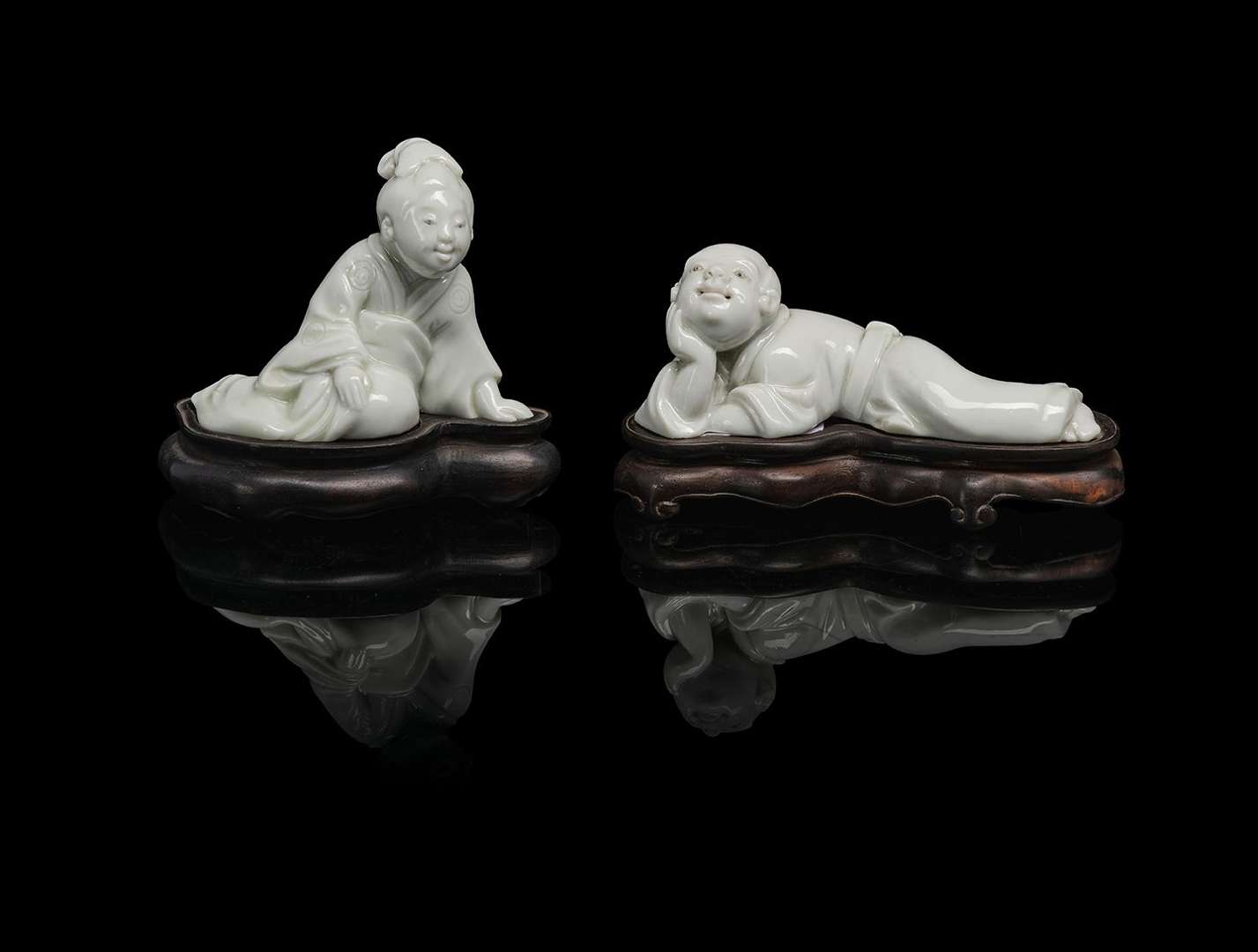Deux petits sujets en porcelaine d'Hirado figurant un homme couché sur le côté appuyant sa tête sur son bras et une femme assise, les jambes sur le côté. Avec leurs socles en bois naturel.
