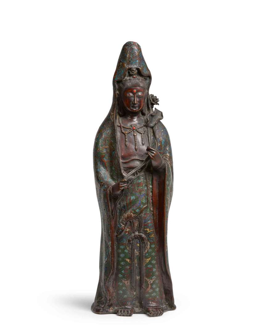 Importante statue de Kannon en bronze et émaux cloisonnés. La bodhisattva représentée debout, tenant une tige de lotus dans les mains.
