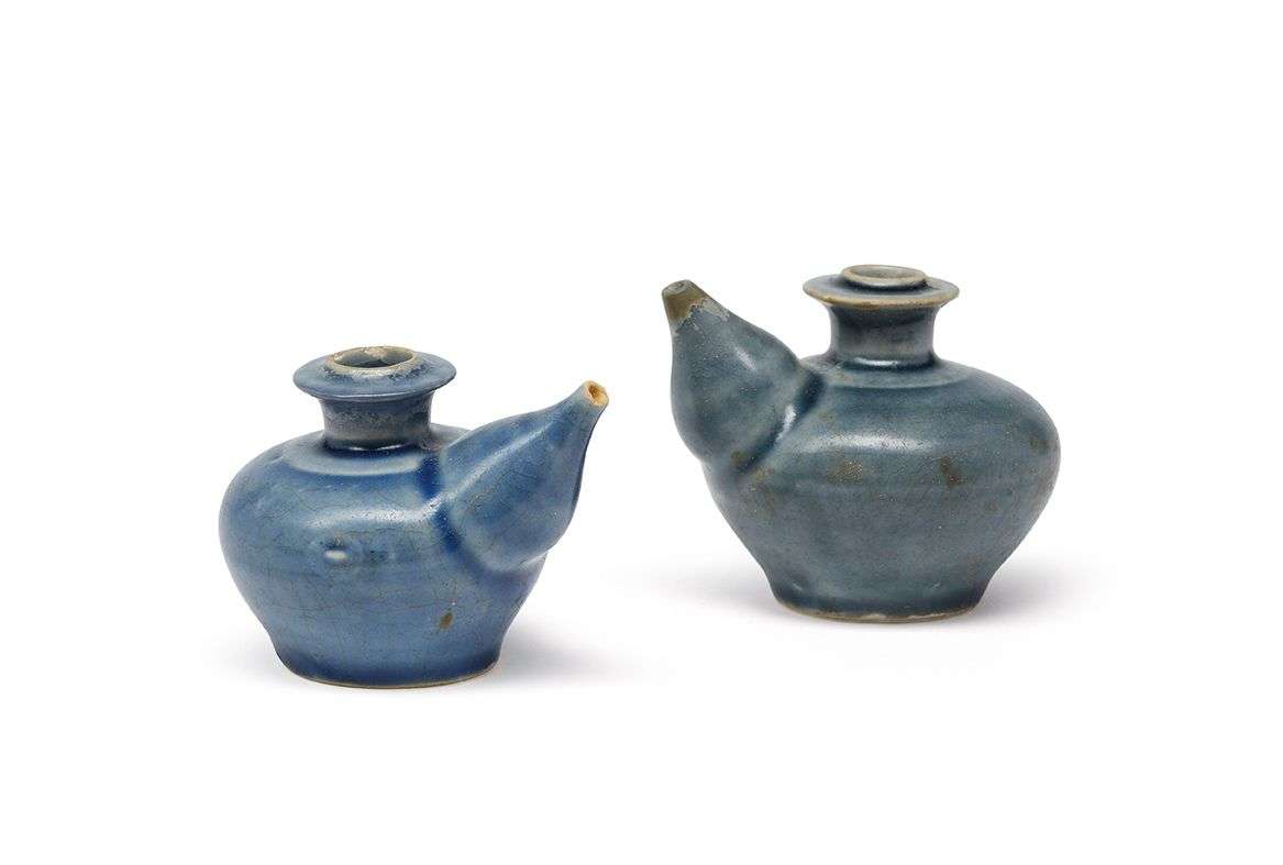 Deux petits kendi en porcelaine monochrome bleue.