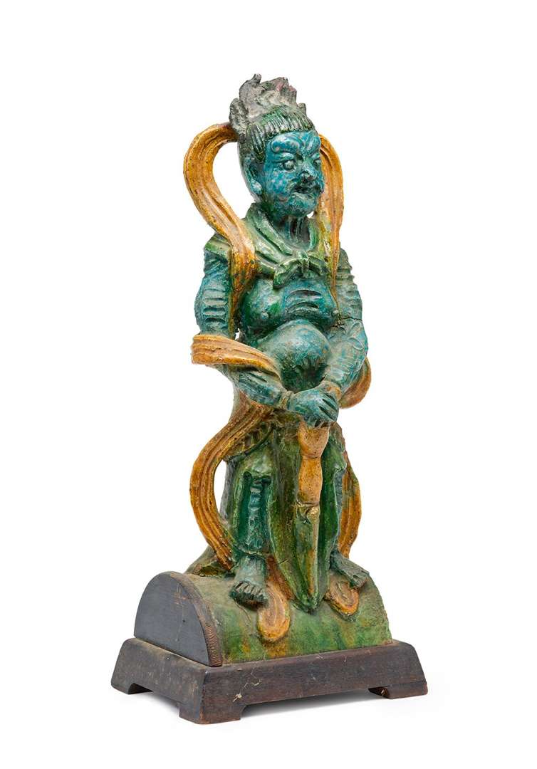 Tuile faîtière en grès à couverte tricolore figurant un démon debout tenant un long couteau, vêtu de grandes écharpes flottantes. Le personnage entièrement polychromé avec des couvertes vert, jaune et turquoise. Avec son socle en bois naturel postérieur.