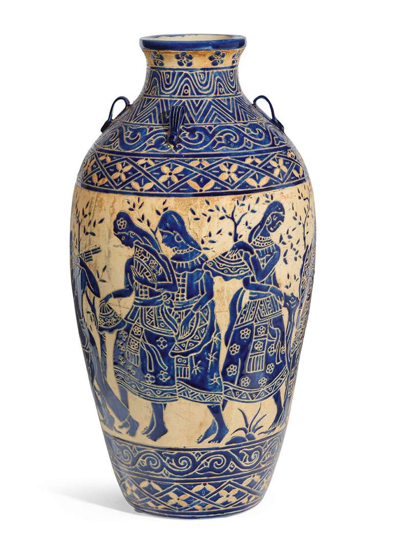 Importante jarre en grès de Bien Hoa de forme ovoïde, la panse partiellement émaillée bleu sur fond ocre d'un orchestre et de danseuses.