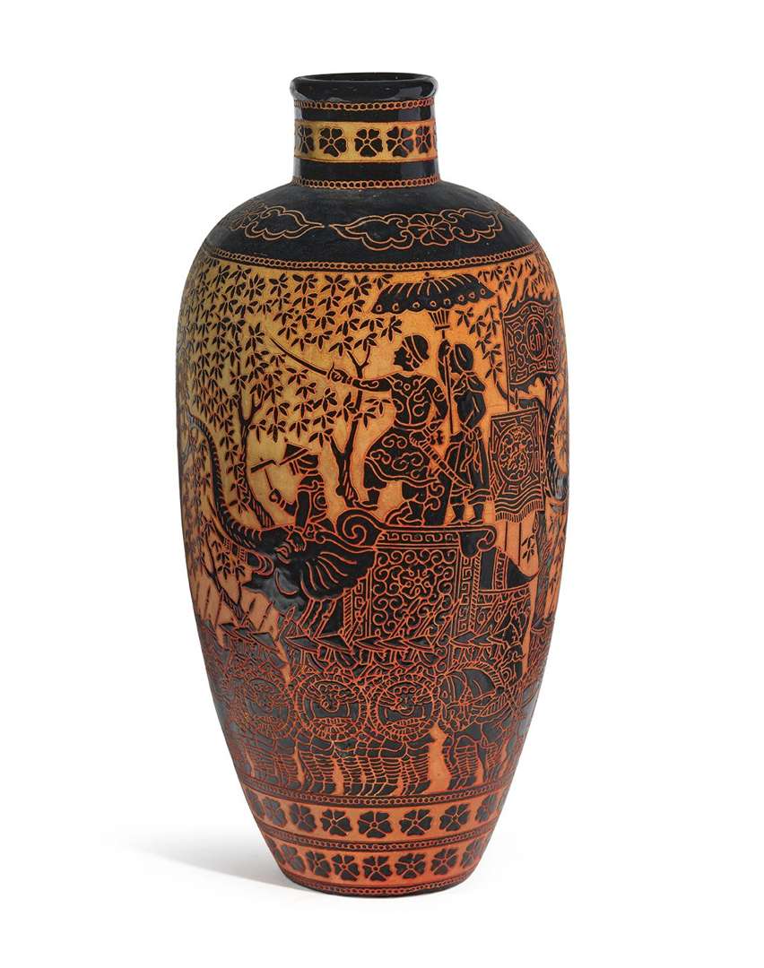 Importante jarre en grès de Bien Hoa de forme ovoïde, la panse partiellement émaillée noir sur fond ocre, d'une procession guerrière sous les ordres des soeurs Trung (Hai Bà Trung) à dos d'éléphant.