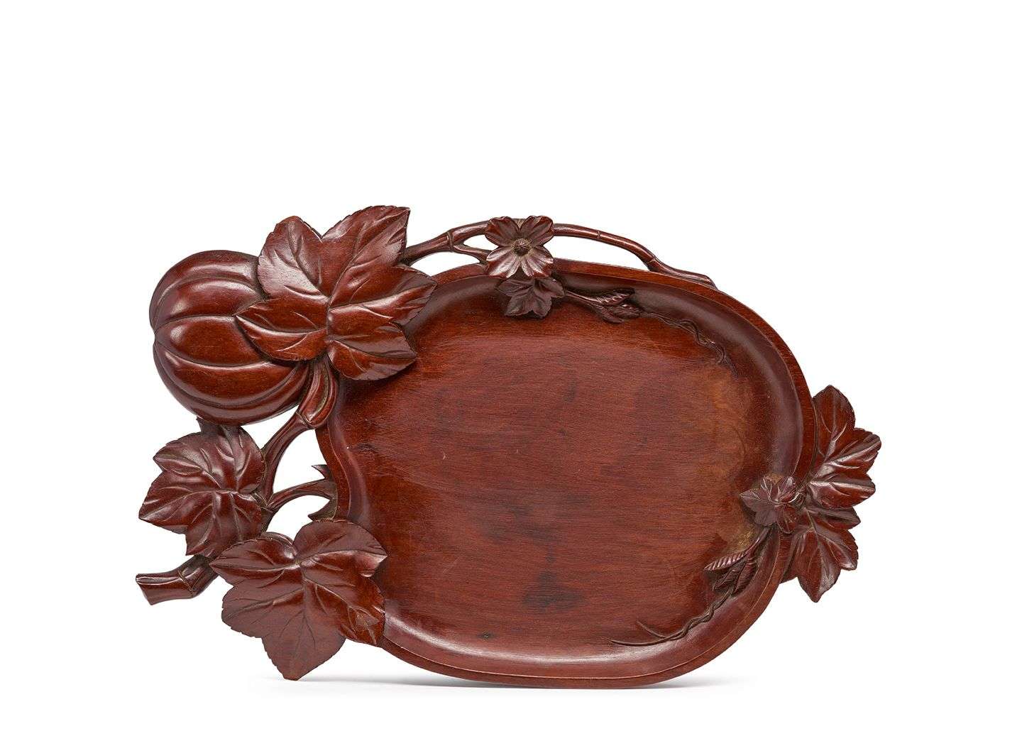 Important plateau en bois naturel sculpté imitant la forme d'une courge, et entourée de fleurs, feuilles et vrilles.