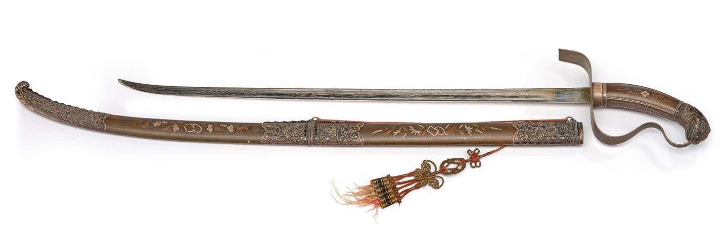 Sabre d'apparat et son fourreau. Le pommeau en repoussé imitant une tête de lion bouddhique, la poignée et la garde en métal incrusté de rinceaux en cuivre et argent. Le fourreau en métal incrusté de motifs auspicieux et rinceaux en cuivre et argent, agrémenté de garnitures en repoussé à décor des « Tu Linh ».