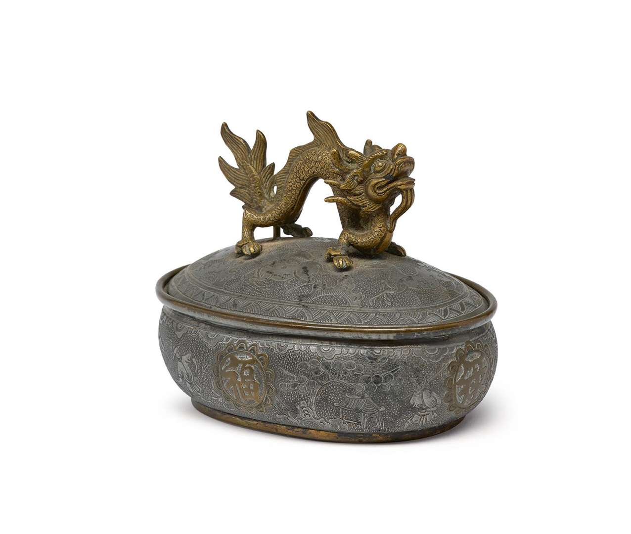 Boîte couverte en étain ciselé de forme oblongue, le corps décoré de scènes agricoles et caractères « Fu ». Le couvercle orné de daims parmi les rochers avec une prise en forme de dragon.