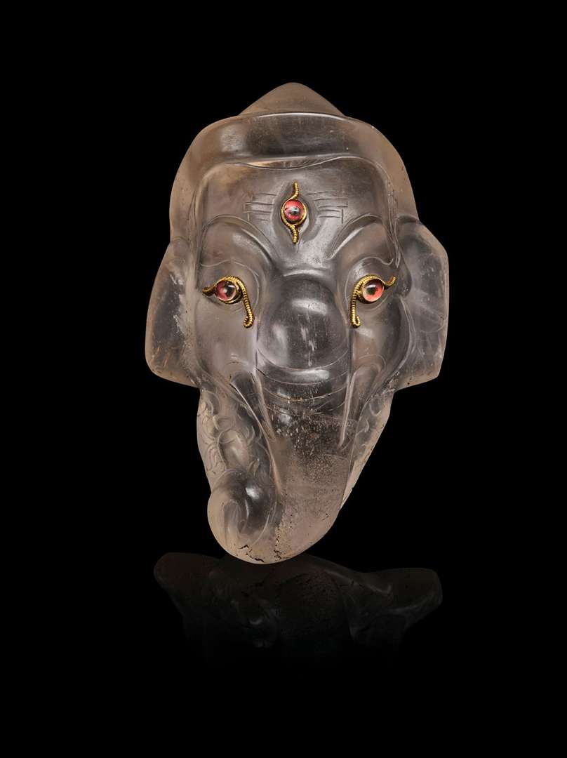 Tête de Ganesh en cristal de roche sculpté. Les yeux sertis de verre et métal doré.