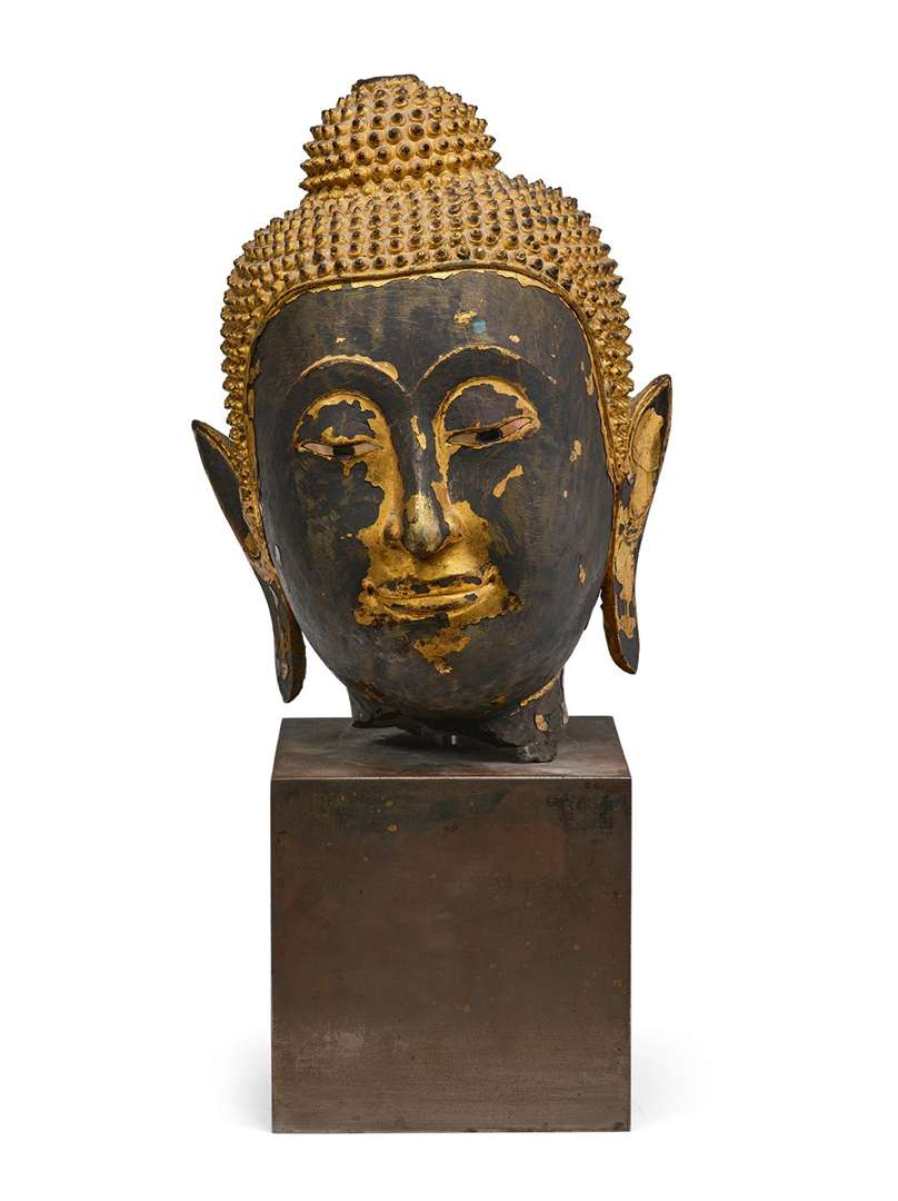 Tête de bouddha en bronze. Les yeux incrustés de nacre, le visage avec des traces de laque dorée. Avec un socle postérieur en métal brun.