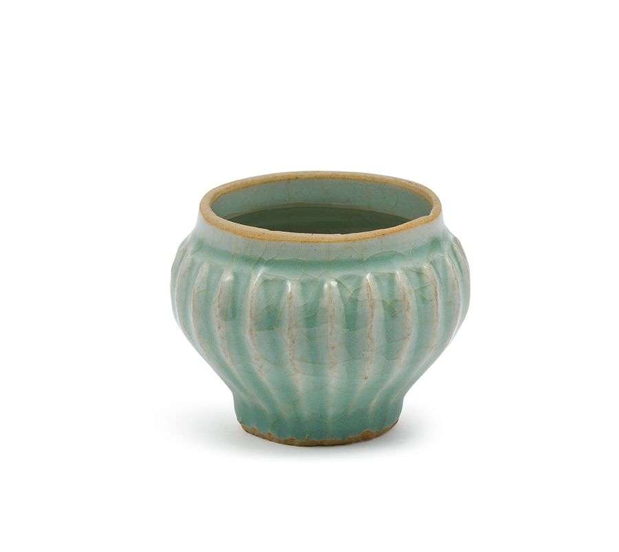 Petite jarre en grès céladon. La panse décorée de godrons. La couverte brillante avec une belle teinte céladon clair.