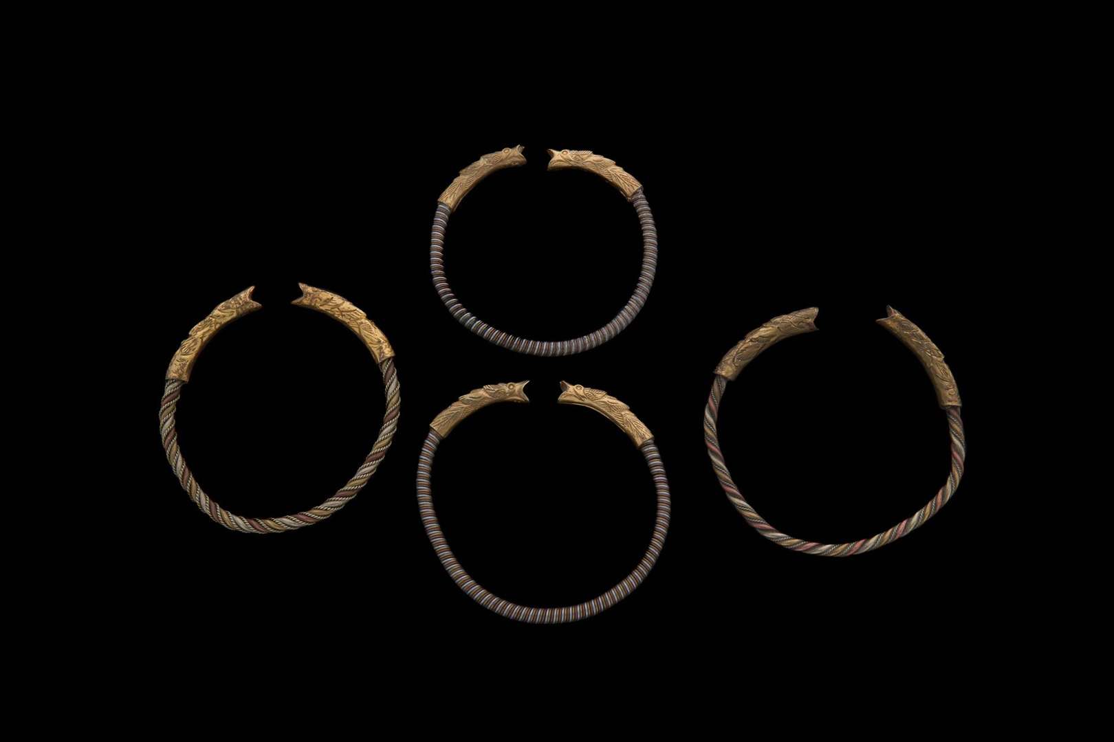 Deux paires de bracelets torque « cinq protections ». Le bracelet composé de fils torsadés d'argent, cuivre, bronze, laiton, fer. Les extrémités en or à tête de Makara