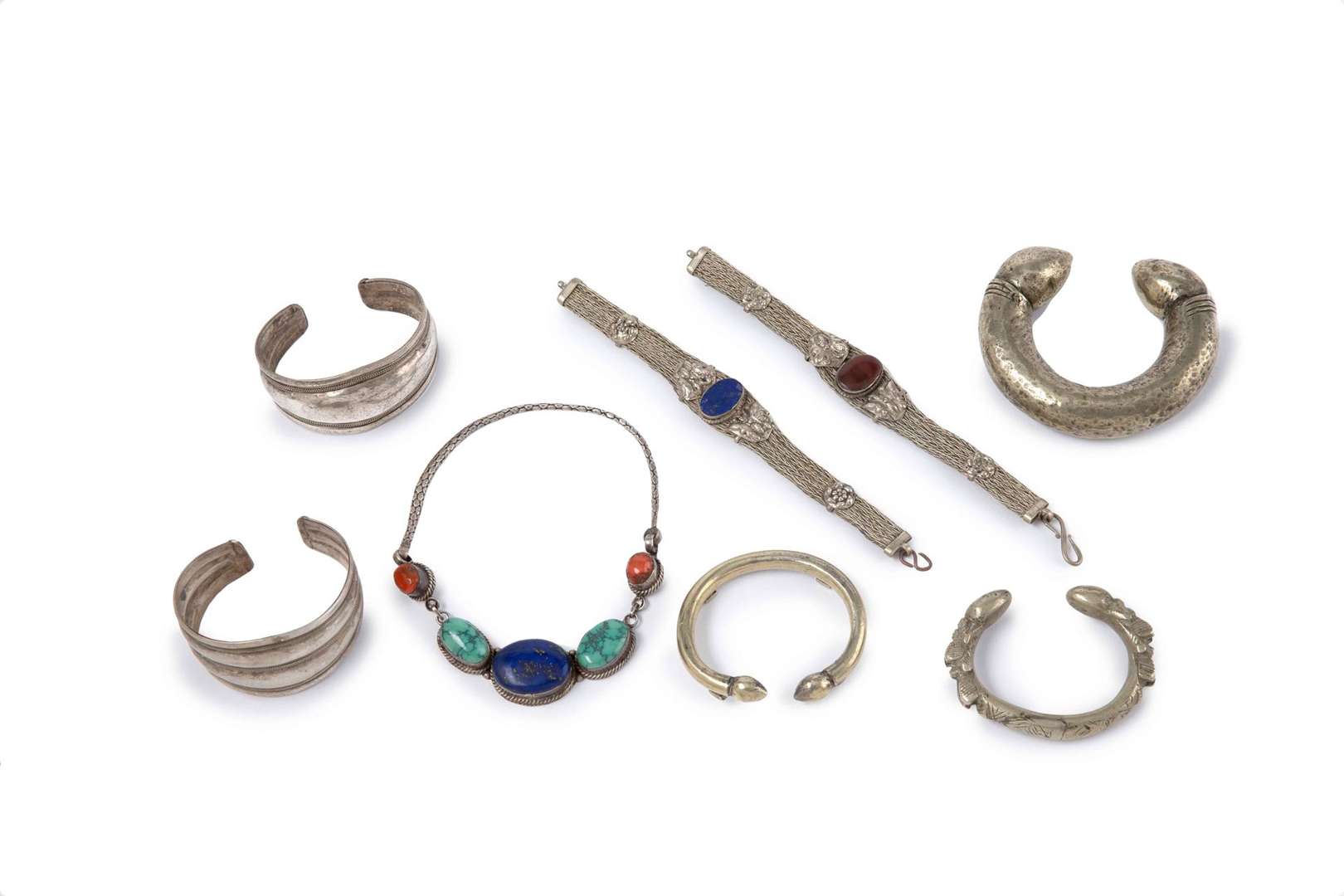 - Un bracelet en cabochons de corail, turquoise et lapis-lazuli