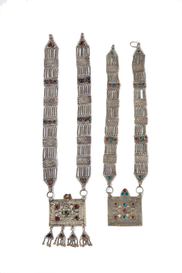 - Deux long colliers (phalakhara) orné de pierres de couleur terminé par un pendentif rectangulaire en alliage argentifère.