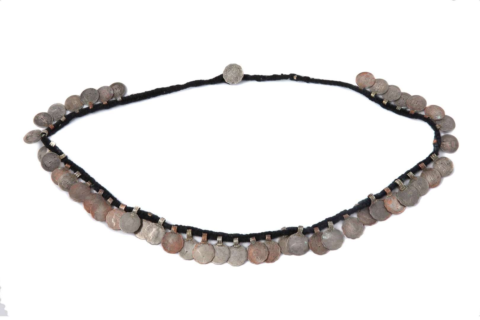 - Un collier composé de pendeloques de monnaie autour d'un pendentif carré