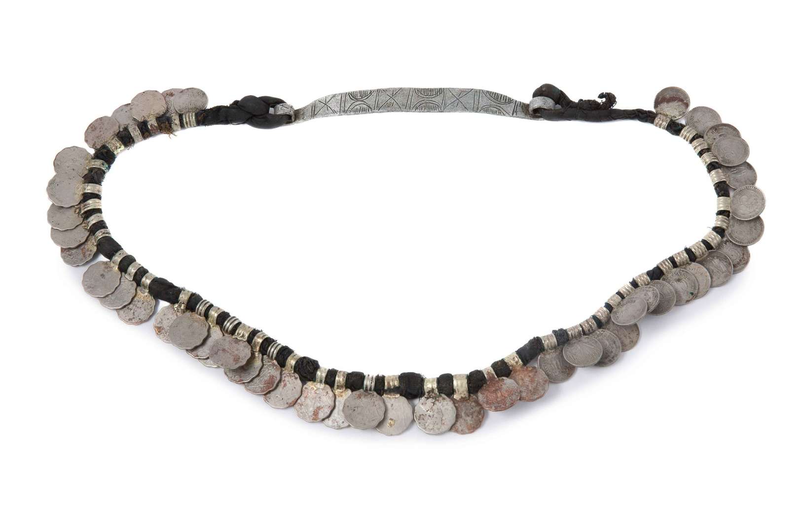 - Un collier composé de pièces de monnaie anciennes et un pendentif en argent et métal argenté à décor de grue (Groupe Tharu).