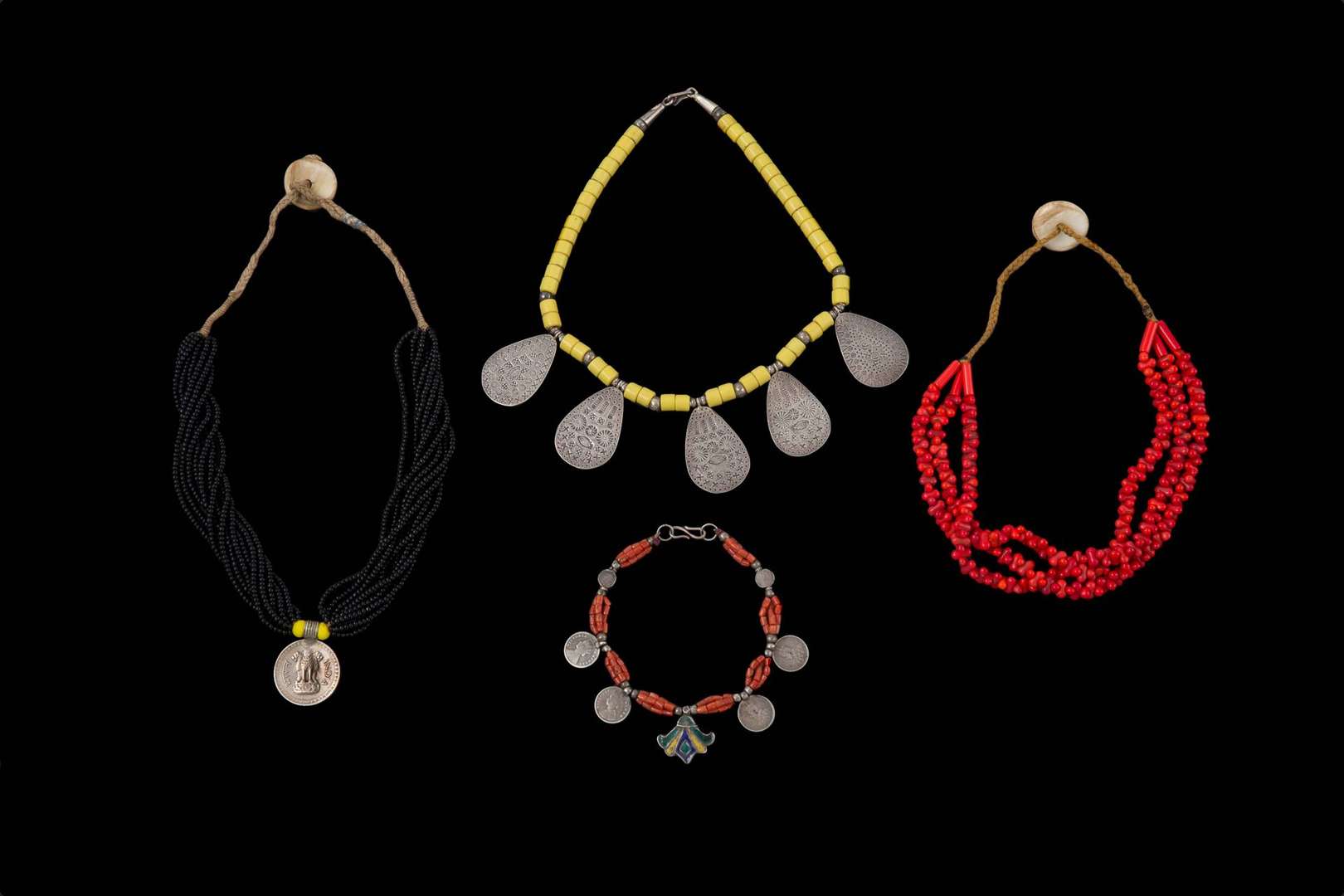 - Un collier en perles de verre jaune avec cinq pendentifs piriformes en argent gravé.