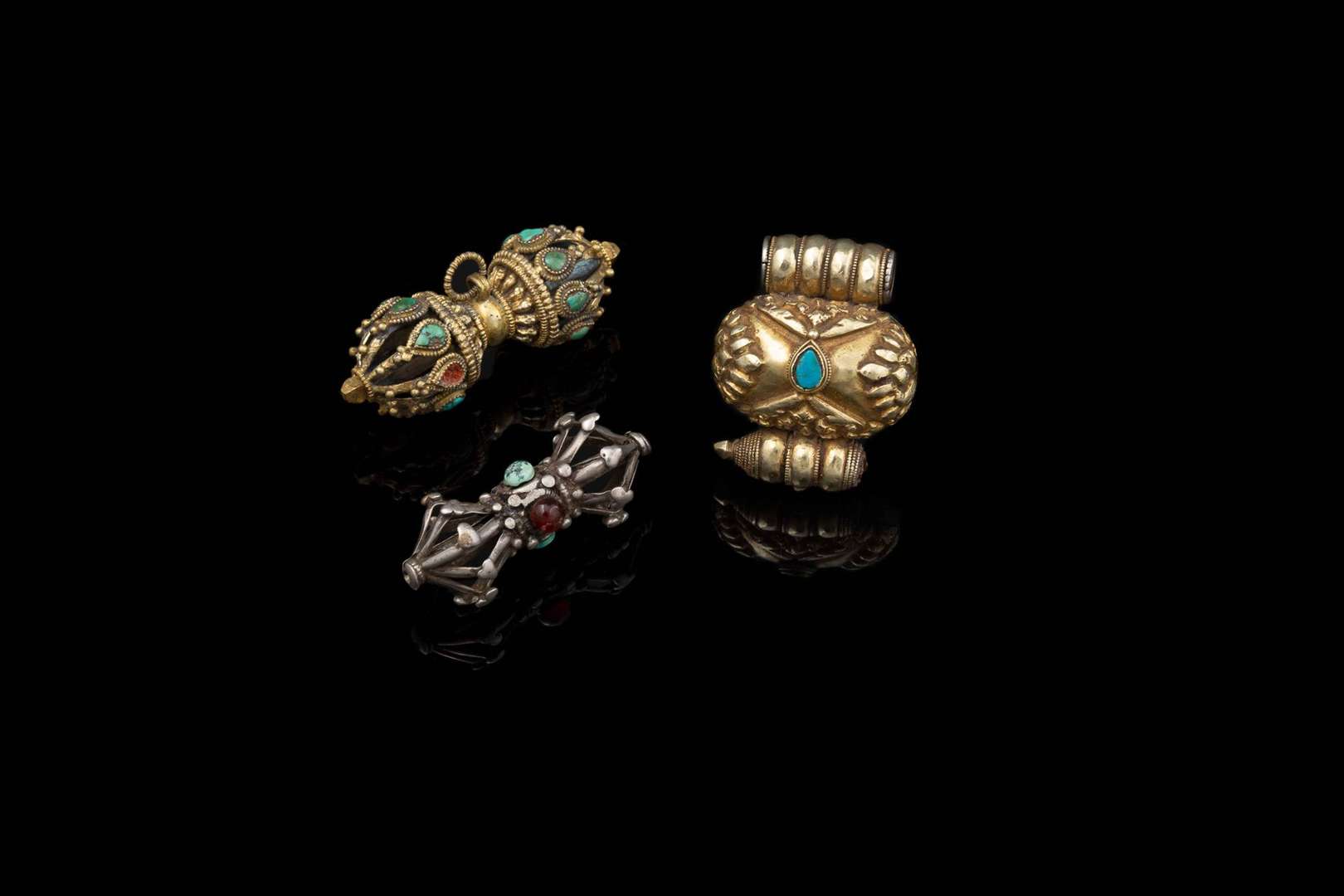 - Un pendentif en argent doré et métal en forme de ga'u avec une turquoise en forme de goutte.