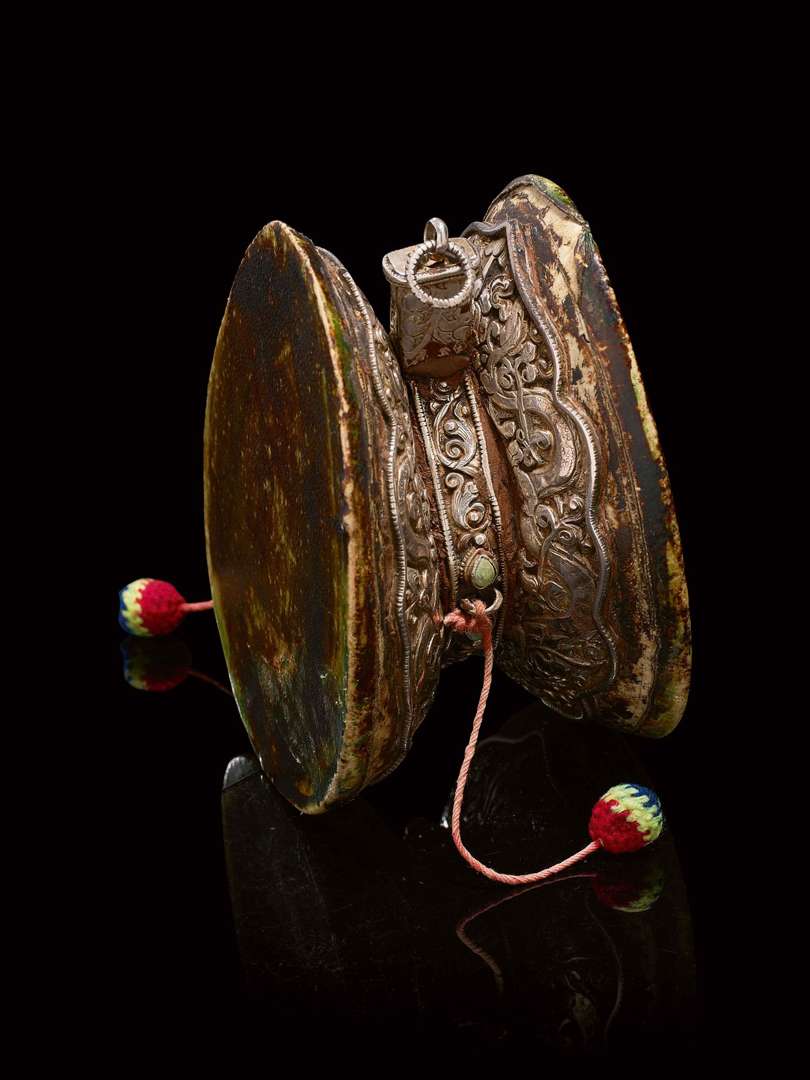 Tambour rituel damaru composé de deux parties de calottes crâniennes avec une monture en repoussé décorée de deux dragons parmi les rinceaux.
