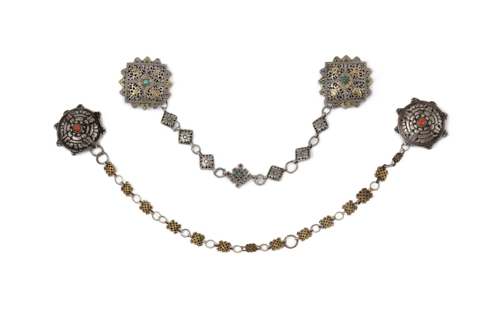 Ensemble de deux paires de broches en métal argenté et doré reliées par des chaînes à décor de fleurettes et noeuds infinis.