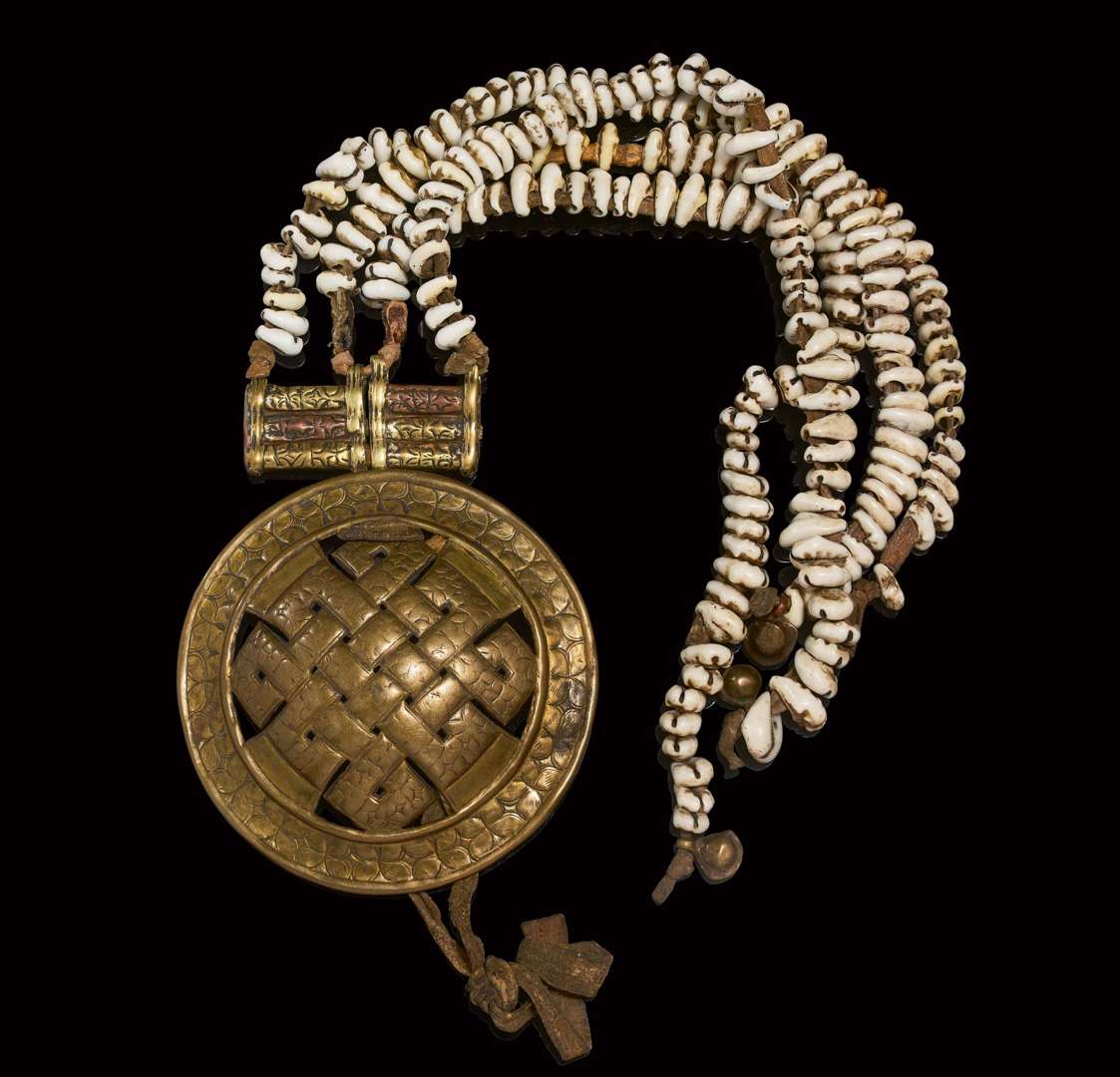 Ornement de ceinture dochas composé d'un large médaillon en laiton orné d'un noeud infini et de pendeloques en cauries.