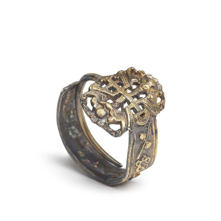 Bague en bronze doré ajouré décorée d'un caractère « Shou » stylisé encadré de deux chauve-souris.