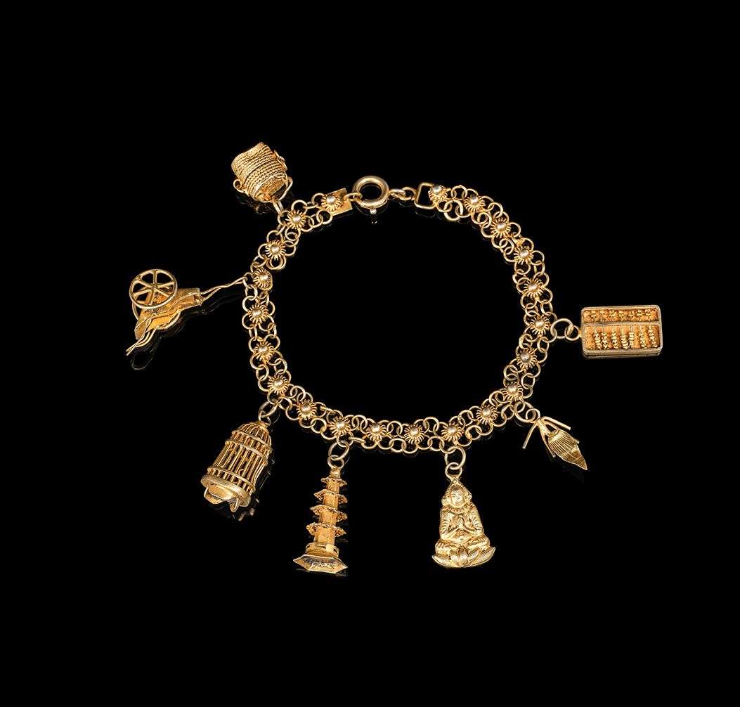 Bracelet en métal doré agrémenté de pendeloques sur le thème de l'Asie (pagode, boulier, bouddha, pousse-pousse...).
