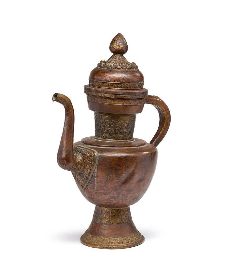 Importante verseuse en alliage cuivreux repoussé ornée de frises géométriques et motifs des « Huit Emblèmes Bouddhiques ».
